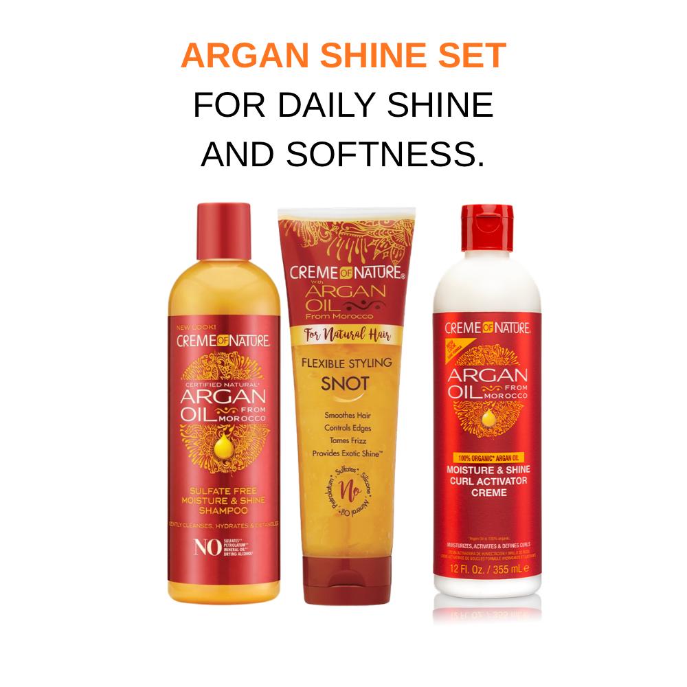Bring together soft, shiny curls and strong, long-lasting styles with this trio of Argan Oil-infused haircare. This set gives you gentle cleansing, intense hydration, and flexible hold — all while enhancing your natural shine.