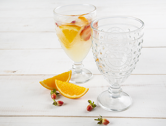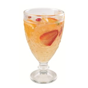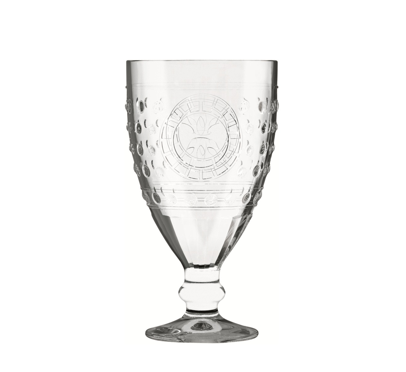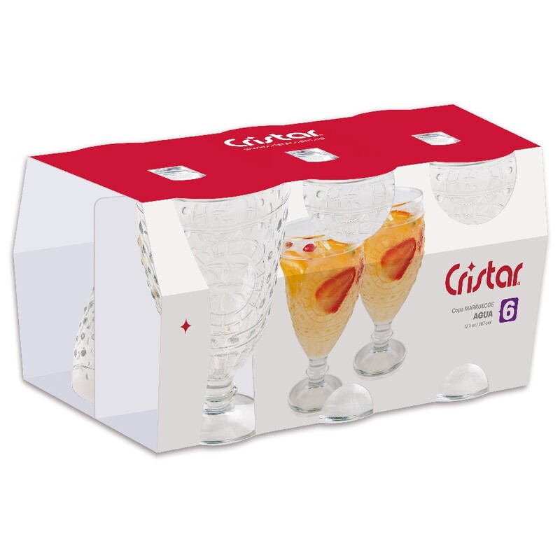 The Marruecos Goblet by Cristar. A stunning, vintage-style stemmed glass featuring intricate embossed patterns and medallion details for a premium tabletop experience.
