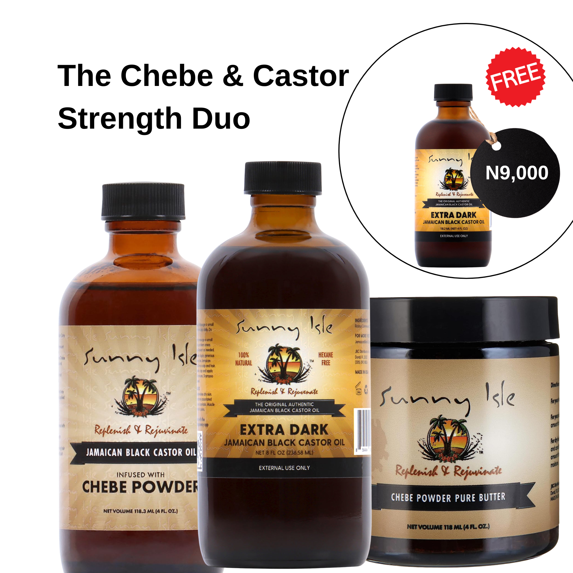 The Chebe and Castor Strength Duo provides deep nourishment for dry, weak, or brittle hair. The combination of Jamaican black castor oil and chebe powder supports stronger strands, improved moisture retention, and healthier scalp care.